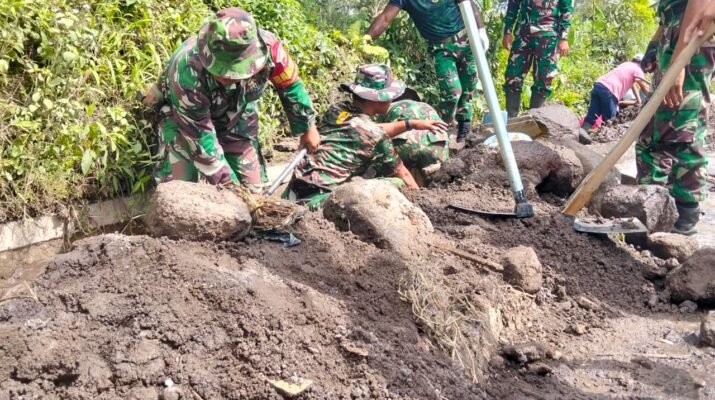Personel Gabungan Kodim 0821 dan Yonif 527/BY Bersihkan Selokan di Jalur Vital Supiturang. Lumajang — Personel gabungan Kodim 0821/Lumajang bersama Yonif 527/BY, di bawah