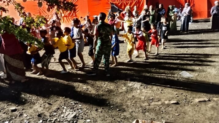 Babinsa dan Relawan Gelar Permainan Edukatif untuk Pulihkan Psikis Anak-Anak Pengungsi di Pronojiwo. Lumajang — Upaya pemulihan kondisi psikologis anak-anak pengungsi akibat erupsi Gunung