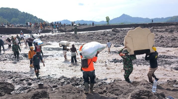 Para personel Kodim dan relawan terlihat bahu membahu mengangkat dokumen penting, barang elektronik, serta perabot rumah tangga yang masih bisa diselamatkan. Proses evakuasi dilakukan dengan penuh kehati-hatian mengingat beberapa rumah masih dalam kondisi licin dan berlumpur akibat terjangan banjir lahar dingin.